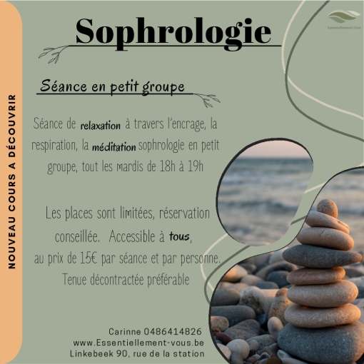 Vous recherchez un moment de bien-être pour relâcher la pression et reconnecter avec vous-même ? Participez à notre atelier de sophrologie en petit groupe à Linkebeek, chaque mardi de 18h à 19h. Cet espace bienveillant vous invite à découvrir les bienfaits de la relaxation, de la respiration consciente et de la méditation sophrologique.